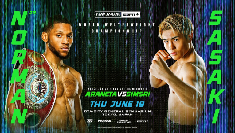 Brian Norman Jr vs Jin Sasaki WBO World Welterweight Title Ota-City General Gymnasium Tokyo, Japan Thursday, June 19th Est. Time: 3:00am cst, Est. Main Event Ringwalk: 6:00am cst ESPN+